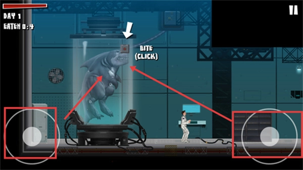 按照界面上的提示,点击“BITE”按钮来执行撕咬动作,同时搭配左右方向键控制移动,以此完成初始的教学任务。