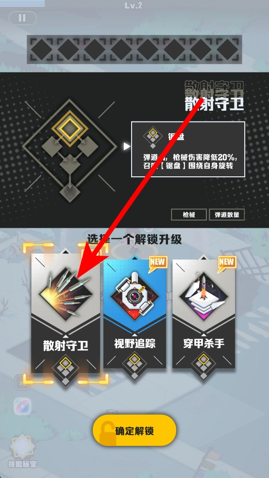 战斗进行时会弹出技能解锁与升级的选项,你可以依据当下的战斗需要,挑选像散射守卫这类合适的技能,点击确定完成解锁后,就能提升角色的攻击能力。