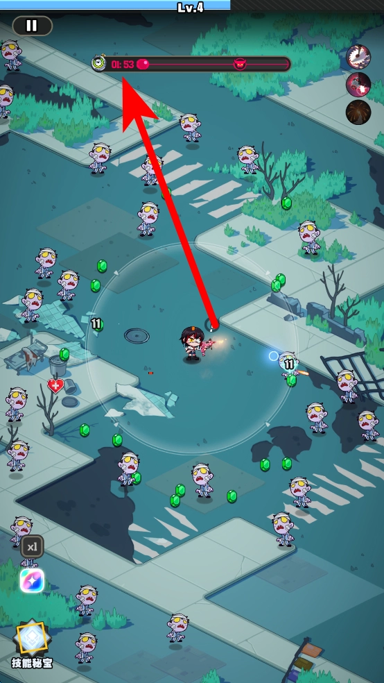 请留意上方的时间限制,在规定时间内尽量消灭更多怪物,同时注意避开怪物的攻击,确保角色可以持续战斗。