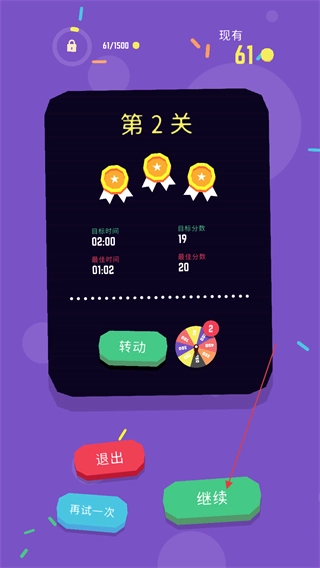 当你冲刺越过终点线,就意味着成功闯过当前关卡;系统会依据你击飞保龄球瓶所获得的分数来评定徽章等级;点击“继续”按钮,即可解锁并进入下一关。