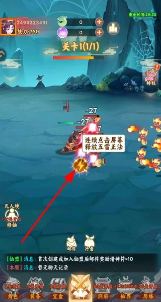 连续点击屏幕释放五雷正法技能,以此攻击敌人、提升战斗效率,助力击败妖怪。