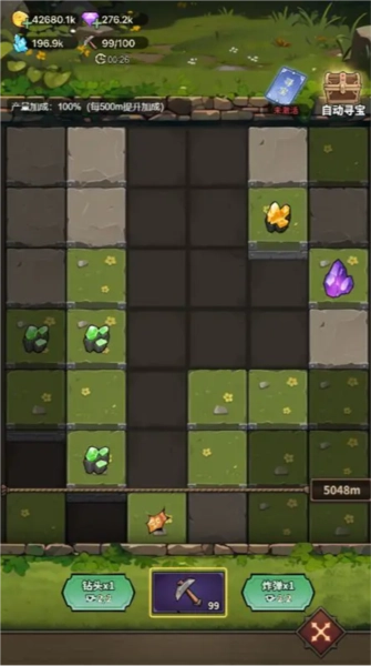 玩家带着镐头去洞窟里寻找宝藏,每用掉一个镐头就能清除洞窟里的障碍,当清除到藏有资源的区域时,就能得到资源(其中主要是获取冥想晶石)。在镐头数量还没到上限的时候,它会随着时间慢慢恢复,一直恢复到上限数量为止。另外,在清除洞窟障碍的过程中,也可以使用钻头和炸弹,这样能一次性清除一大片障碍,从而获取到更多的资源。