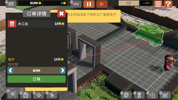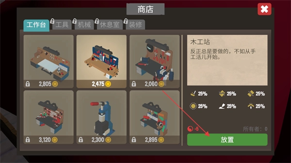进入商店界面,挑选合适的工作台(例如木工站),点击放置按钮将其布置在工厂内部,以此来拓展工厂的生产能力。