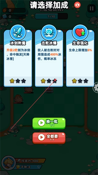用刀剑发起攻击,获取到带有问号的气泡后,就能挑选一项加成来提升自身属性。