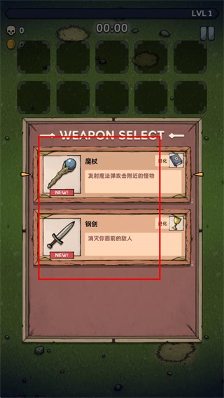 武器选择界面中,玩家可获取多种类型的战斗装备,像具备范围攻击能力的魔杖、专注于单体输出的钢剑等。并且,武器的效果会依据关卡内的怪物特性进行随机适配,使得每一局冒险时,玩家所使用的武器组合都有可能不一样,这让整个探索过程充满了策略性。