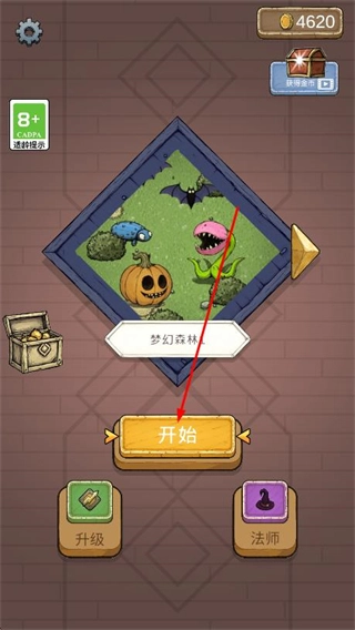 在主界面找到梦幻森林关卡并选中,点击开始按钮后,就能开启石窟地牢的冒险之旅了。