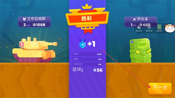 摧毁敌方坦克后,即可获取胜利奖励,点击下一步便能继续挑战后续关卡。