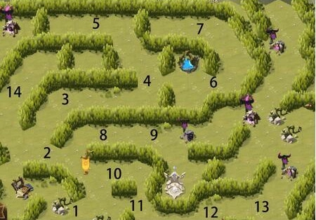 按照图里的数字顺序清理14只怪物,收集完14个增益效果、招募2名绿裔队友后,前往左侧挑战绿裔队伍,打开草丛再到右侧获取神器。