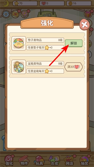 点击解锁按钮即可启用垫子类物品的强化功能,强化后每个垫子每日都能产出金币,这些金币可用于积累解锁更多强化项目。
