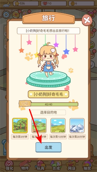宠物旅行时,选定目的地后点击出发就能开启旅行任务,不同任务的耗时长短不一,完成后可获取对应的奖励,帮助宠物成长以及店铺资源的积累。
