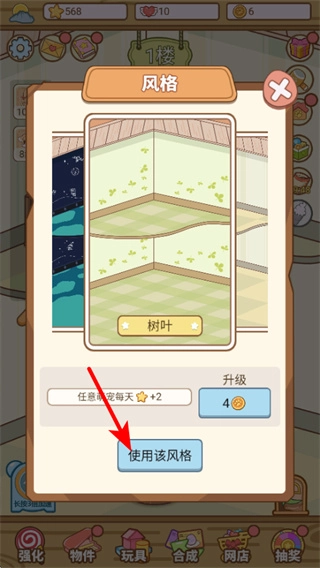 在风格设置界面点击“使用该风格”按钮,就能切换店铺的风格样式,比如换成树叶风格。完成更换后,店铺会呈现出不一样的视觉感受,还能让宠物的生活环境氛围变得更舒适宜人。