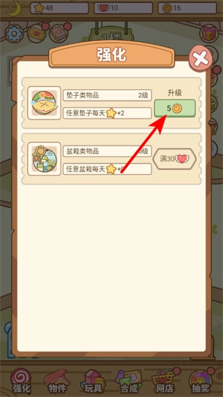 点击升级按钮并消耗金币,就能对垫子类物品进行强化;强化之后,每一个垫子每天带来的金币收益都会有所提升,这样就能积累更多资源,助力店铺进一步发展。