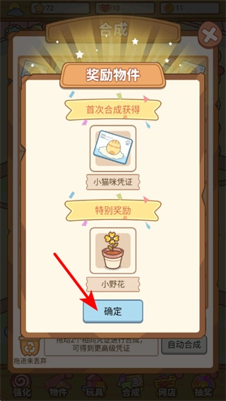 合成获取奖励物品后,点击确定按钮即可领取奖励,例如小猫咪凭证、小野花等;领取的奖励能够用来解锁新宠物或装饰店铺,从而丰富游戏内容。