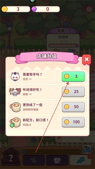 积累金币后,可用于店铺升级,比如消耗3个金币增加店员,以此提升店铺运营效率,从而吸引更多顾客。