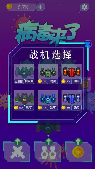 核心玩法:以关卡挑战为核心,玩家需在躲避密集弹幕的同时,消灭源源不断袭来的病毒敌机。通过收集游戏内的金币资源,可对您的战机进行培养与强化升级。操作方式延续经典飞行射击游戏的设计:点击屏幕即可发射子弹,拖动战机则能控制其移动轨迹。