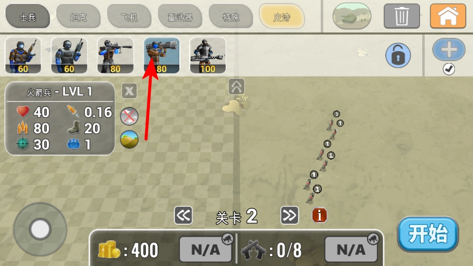在部队选择界面,点击火箭兵即可将其编入己方部队。该兵种拥有远程攻击能力,是压制敌方步兵的有效单位。