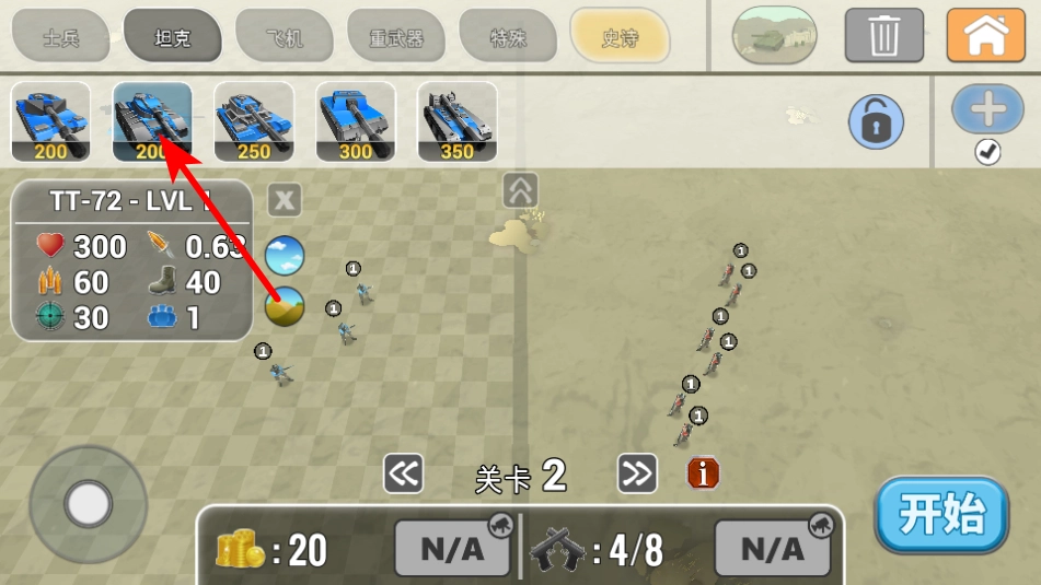 在部队选择界面,点击TT-72坦克即可将其编入阵容;该坦克拥有较高的生命值与输出能力,既能有效承受伤害,也能对敌方单位造成打击。