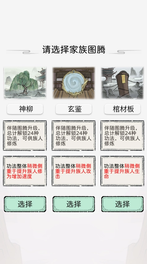 接下来选择家族图腾,目前有三种可选:神柳、玄鉴和棺材板。
