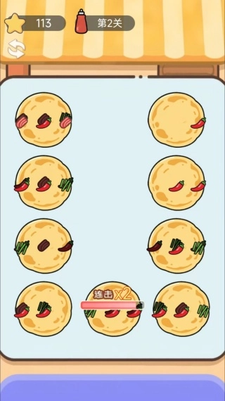 观察煎饼上的各类配料,只要把三个一样的配料连起来就能完成消除。