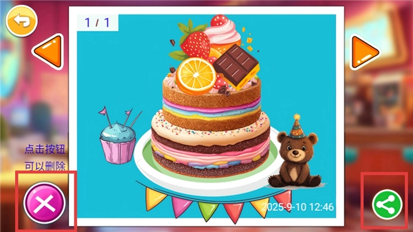 在蛋糕照片展示页面,若要删除照片,可点击左侧的粉色叉号;若想分享照片,则点击右侧的绿色分享按钮即可。
