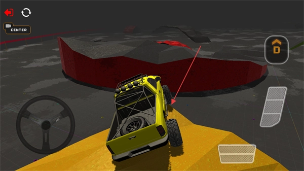 转动方向盘把控方向,驾驶越野车朝着绿色坡道冲去,完成飞跃的特技动作。