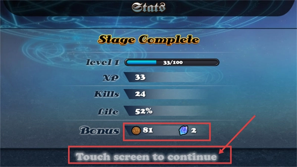 关卡完成后可获得【81-金币】与【2-水晶】的奖励,点击【Touch-screen-to-continue】即可开启下一段防御挑战。