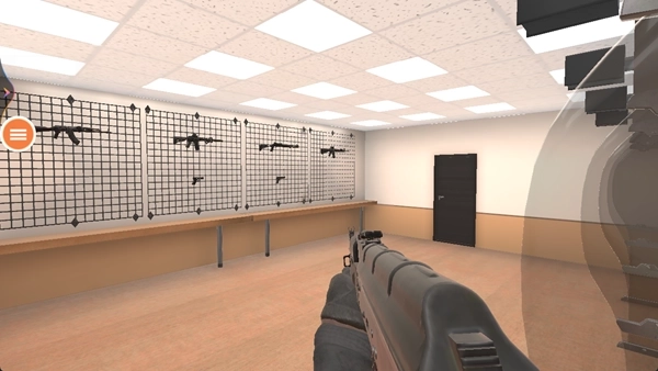 2、进入武器室后,通过查看界面陈列的枪械,熟悉射击、换弹等基础操作,为后续任务准备合适的武器。