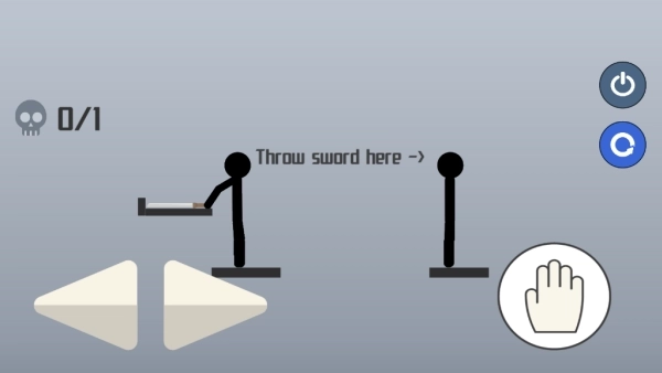 4.如下图所示,你需要长按右侧按钮,接着调整火柴人的手臂角度,之后松开右侧按钮就能完成武器投掷。