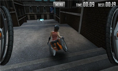 玩家操控着一辆轮椅,驶过桥梁与台阶,界面设有左右两个虚拟按键,轮椅移动起来十分灵活,却不太容易掌控。
