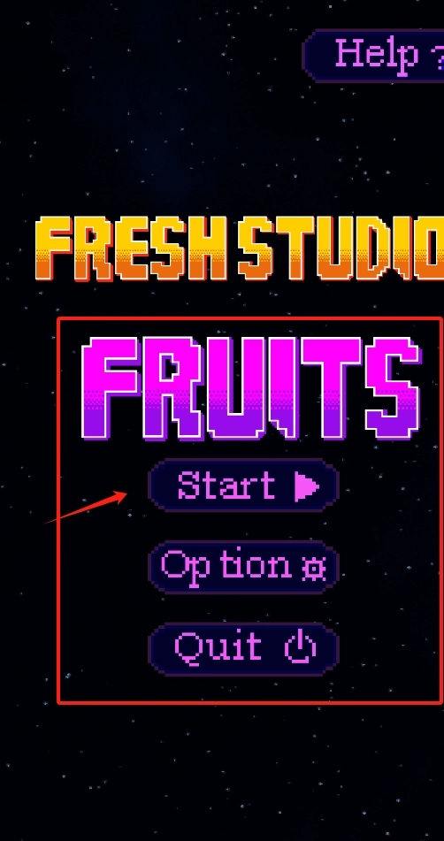 1、点击红色框内的Start按钮开始游戏,Option可用于调整设置,Quit为退出功能,右上角的Help按钮可查看帮助说明。
