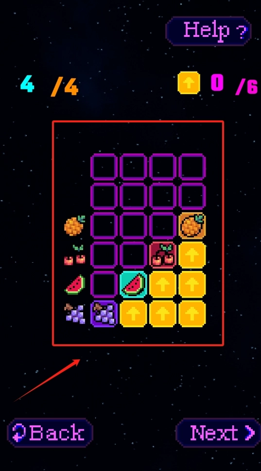 3、点击黄色箭头按钮来处理水果,按Next进入下一关,Back能够退回上一步进行调整。
