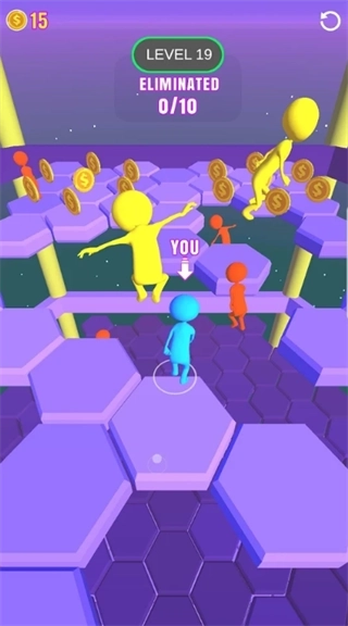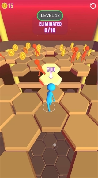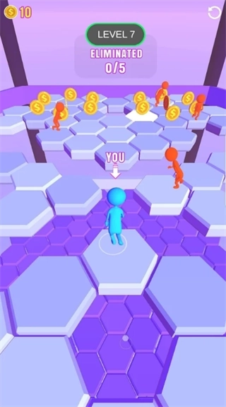 1、这款游戏有着简单的跳跃玩法,十分锻炼玩家的敏捷能力。玩家将和其他对手一同在一个平台上展开竞争,过程中需要快速踩中平台上的六边形角色才能继续推进,你得用最快的速度去踩这些六边形,以此来获取更高的分数。