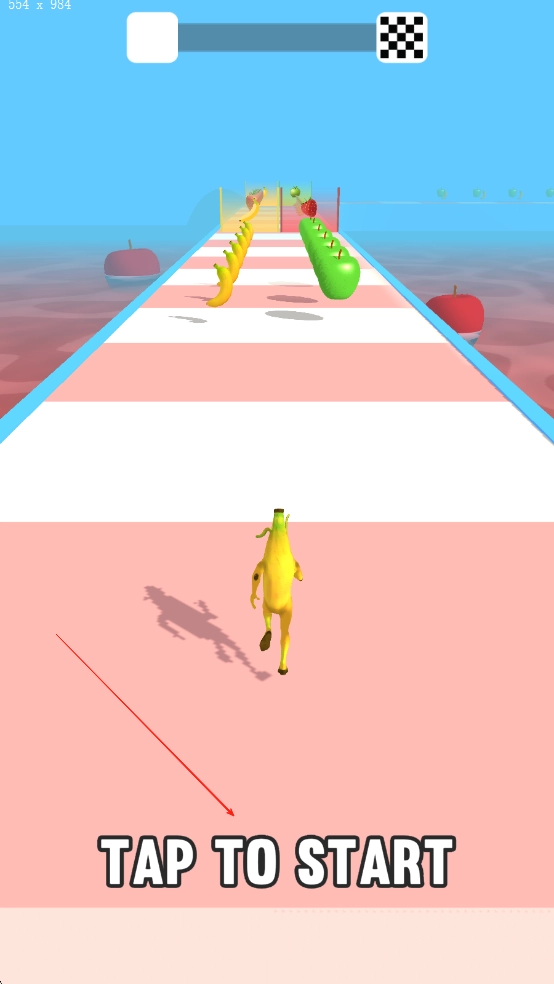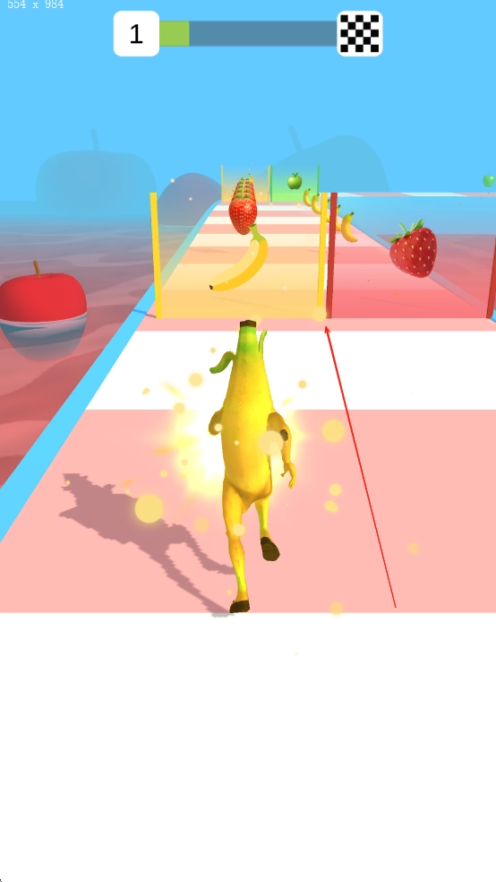 在跑道上拾取四处散落的苹果、香蕉之类的水果,每集齐10个水果,巨人体型就会提升1级,同时解锁“水果弹幕”技能,点击屏幕就能发射水果攻击前方的障碍物。
