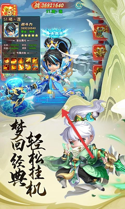 可以查看角色的战力情况,为其搭配合适的技能,借助挂机的方式推进游戏进程,从而获取资源来提升自身实力。