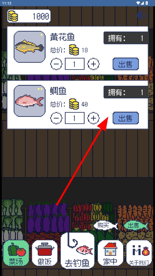 在菜场的售卖界面,你可以调整想要出售的鱼的数量,之后点击出售按钮就能获得金币。