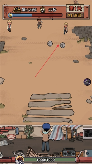 2、战斗时点击屏幕扔石块攻击拆迁队,别让他们靠近家园,还要留意躲开敌人的攻击。