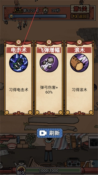 3、每当成功抵御一定波次的敌人后,就会弹出技能选择界面,你可以从中挑选电击术、飞弹增幅、滚木等技能来提升自身的战斗能力。