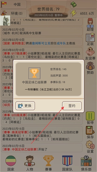 在赛事界面中,点击签约按钮,通过聘请教练或者签约球员的方式,来提升球队的整体实力。