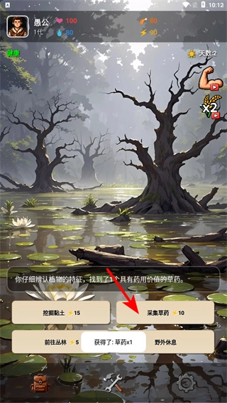 选择采集草药这类生存技能操作,技能的执行是确保健康的关键步骤,完成操作后就能获得草药来恢复健康,从而维持良好状态。