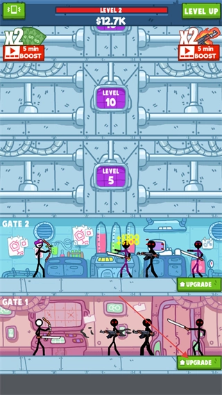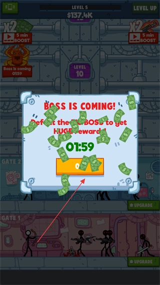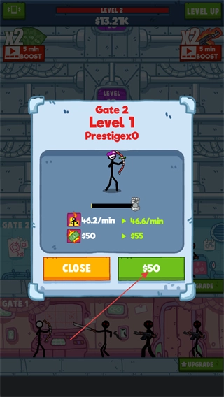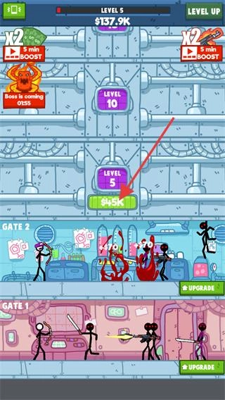 根据需求决定是否消耗一定数量的金钱,来提升火柴人获取金钱的速度以及每分钟的攻击伤害。