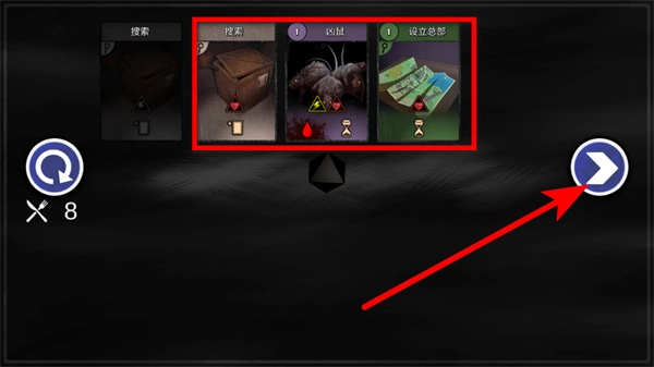 在选定对应的选项后,点击右侧的箭头按钮以进入下一步操作,此过程中或许会引发角色受伤之类的事件,需要依据角色的状态以及事件的具体情况来做出决策。