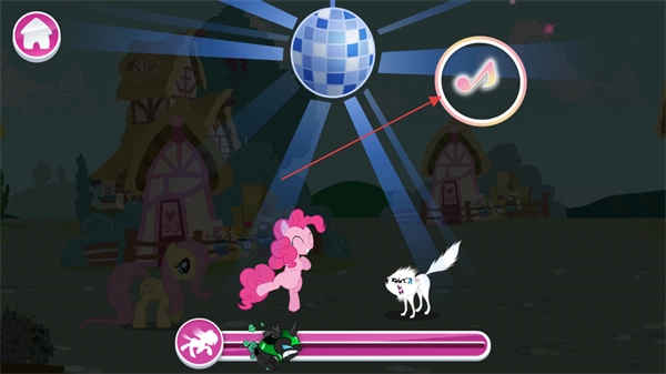 在迪斯科的场景里,点击音符形状的图标,完成互动操作,以此来对抗反派角色。