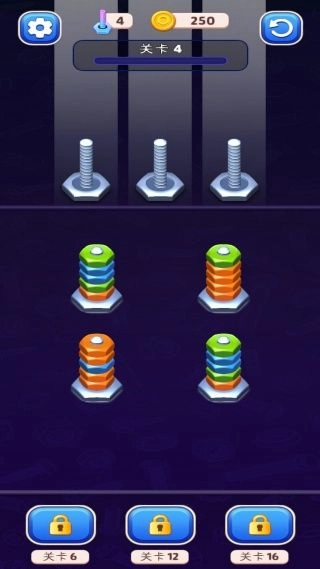 3、随着关卡的逐步推进,你需要应对数量不断增多、色彩组合愈发复杂的螺母排序任务,以此来挑战自身的规划能力。