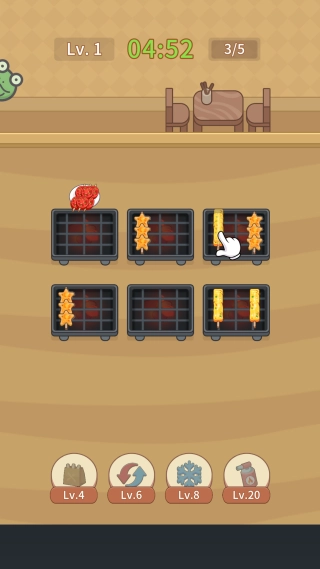 2、被消除的食材会自动进入准备区,您得巧妙地把它们组合起来,再拖拽到烤架上,制作出符合订单要求的烤串,顺利交付就能得到金币和好评。