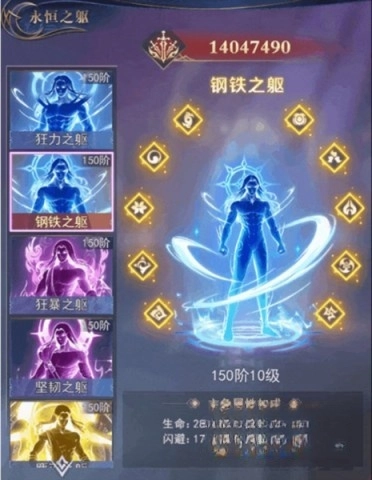 在游戏中,所有类型的身躯都是分阶段开启的,跟随主角的突破等级开启新身躯。每种身躯的升级都会有最高限制,当达到上限后便无法再继续升级。