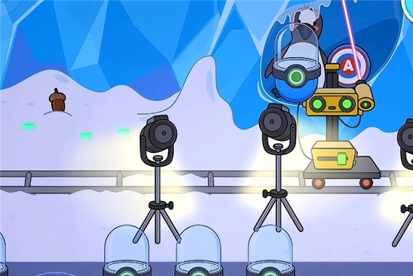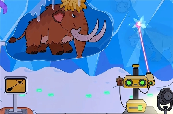 4、比如在这里我拖动激光把冰块融化,就能看到长毛象和小企鹅啦;
