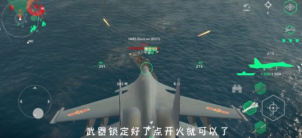3、屏幕向上滑动对应拉升操作,向下滑动对应俯冲操作,武器锁定后点击即可开火。