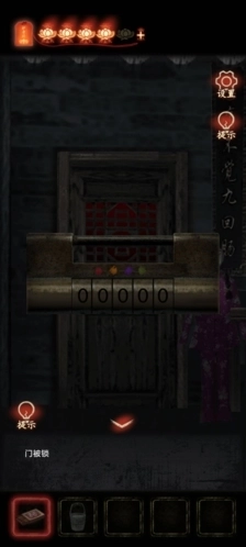 1、尝试点击花圈获取【铃铛】,在门口找到【羊角锤】,点击左上角的布,用羊角锤敲开后拿到【玉球】,将铃铛和玉球放置在右侧石狮子上,石狮子右边有个拼图类机关。