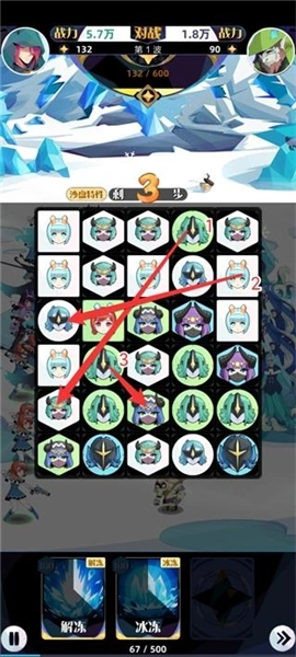 沙盘中高形态的怪物建议优先用冰冻消除,这样能避免它们占用沙盘空间。就像图里展示的操作那样,先把绿色形态消除转化成蓝色,接下来就能合成出紫色的史诗形态了;而且冰冻合成后的怪物会自动上场,把高形态的怪物清理掉后,整体战力就能提升不少。