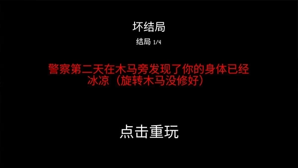8、触发第一个结局——坏结局:由于旋转木马未能修复,第二天警察在木马旁边发现了你的身体,早已变得冰凉。